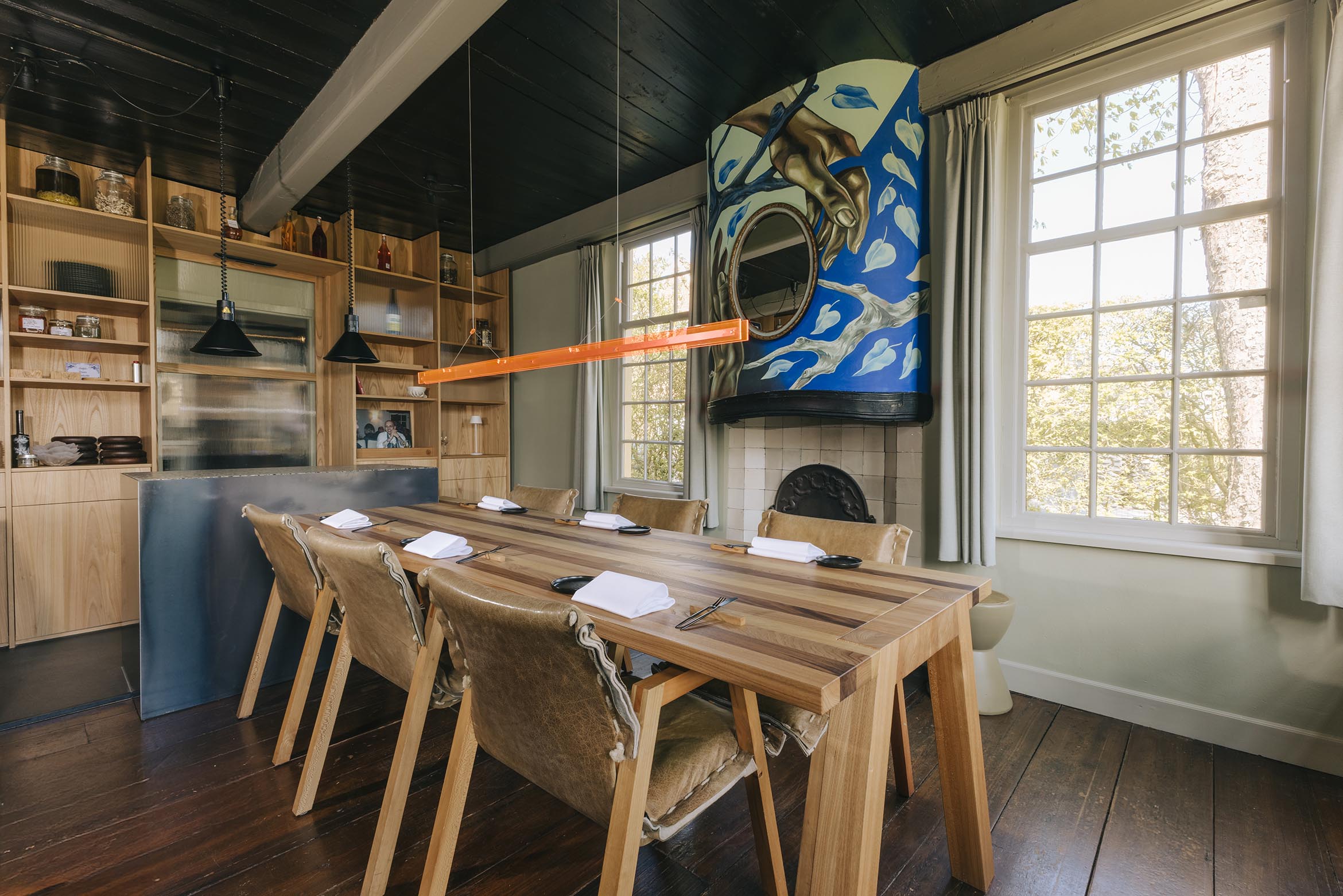 Materialiteit en herkomst spelen een essentiële rol. De tafel is vervaardigd uit hout van Nederlandse fruit- en notenbomen, wat niet alleen zorgt voor een warme, natuurlijke uitstraling, maar ook aansluit bij de duurzame visie van het restaurant.