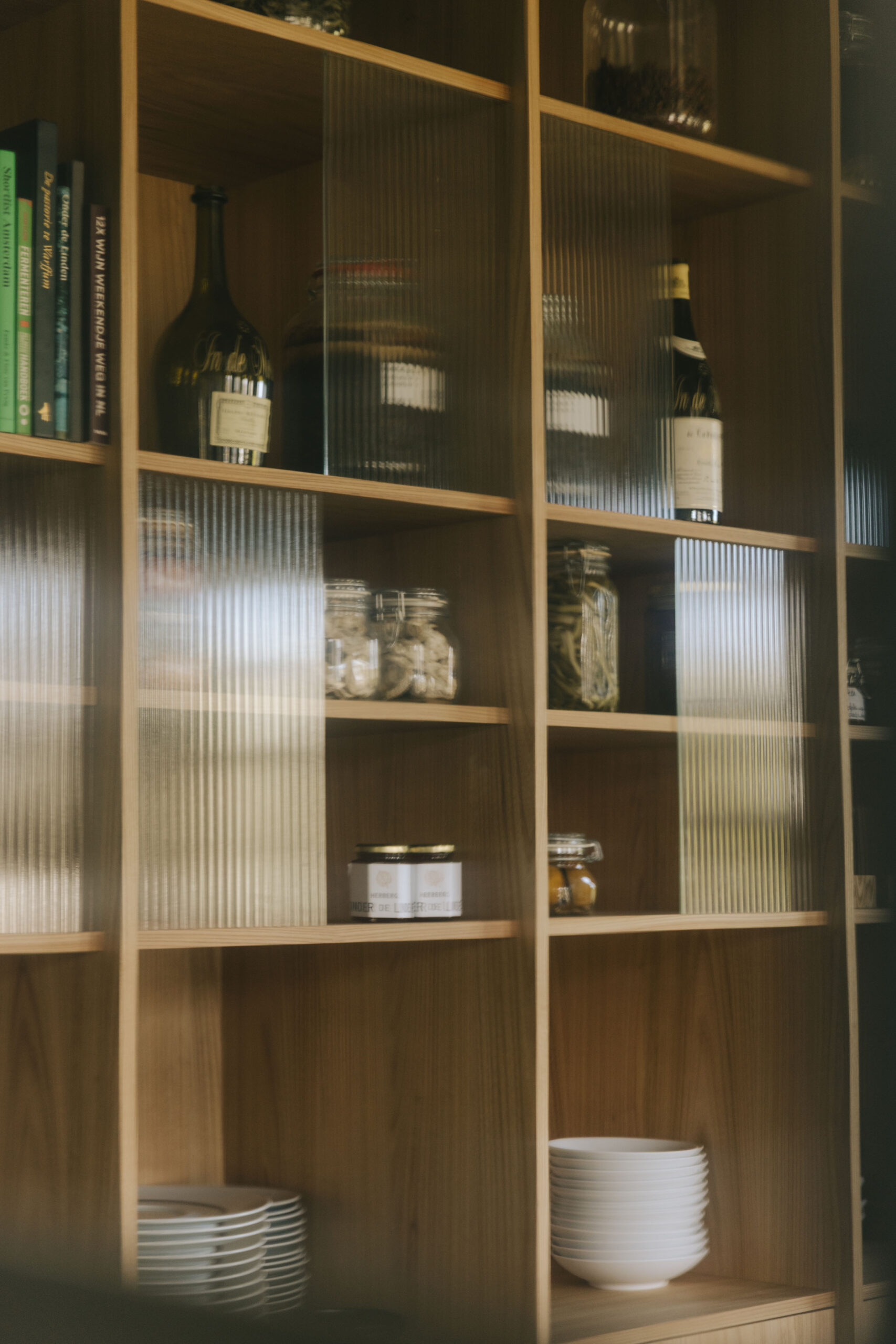 Vanuit deze basis ontwierpen Manon een tafel die naadloos overvloeit in het keukenblad, waardoor koken en presenteren één geheel worden. Achter de tafel zorgt een op maat gemaakte kast met schuifdeur voor rust, functionaliteit en een gelaagd decor van persoonlijke objecten.