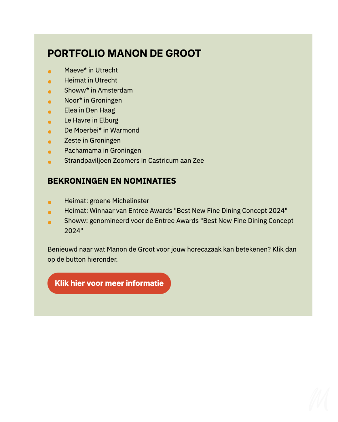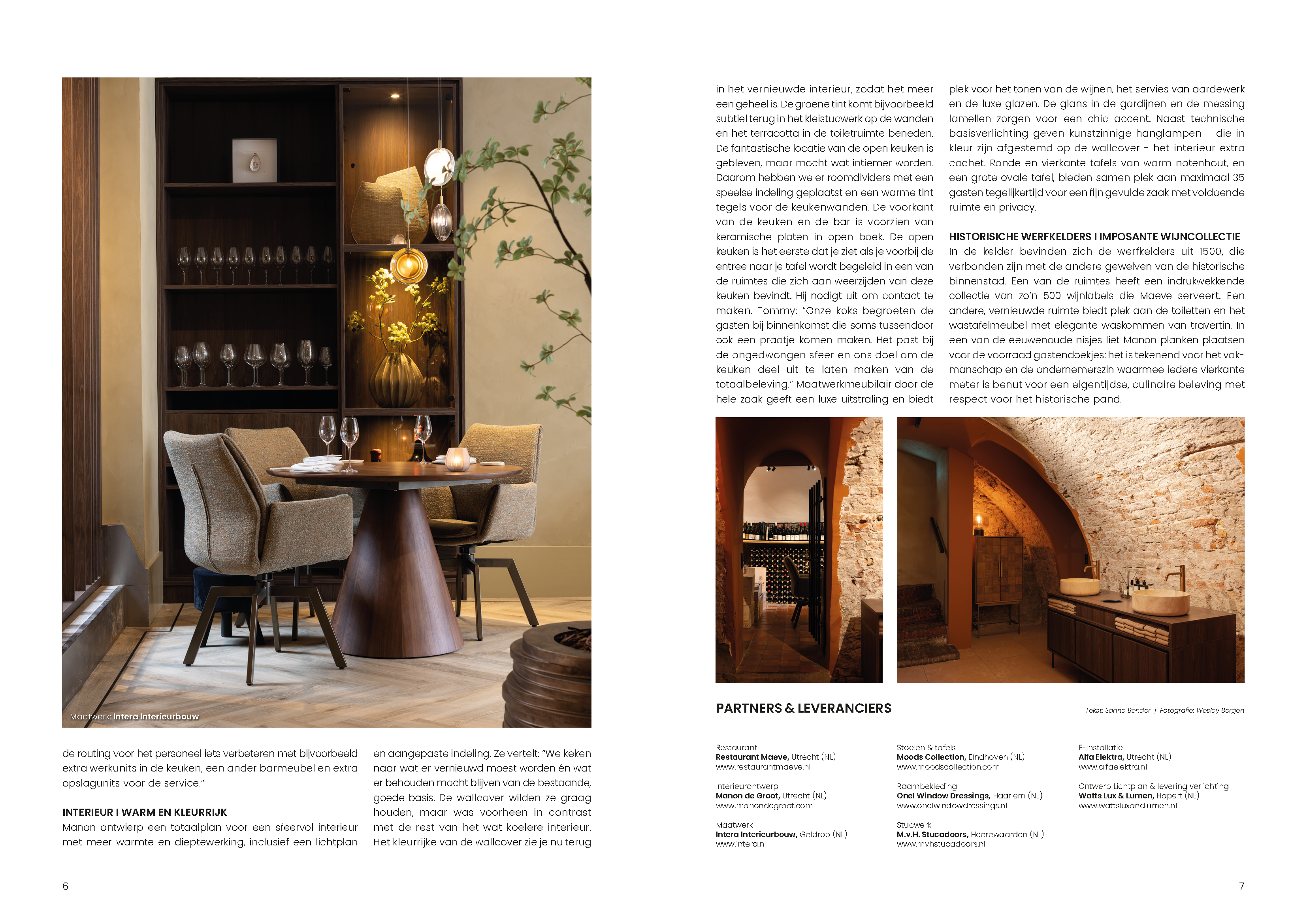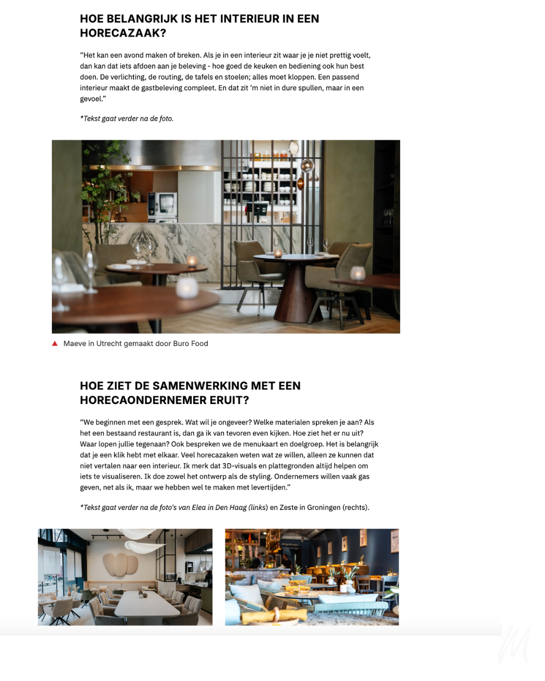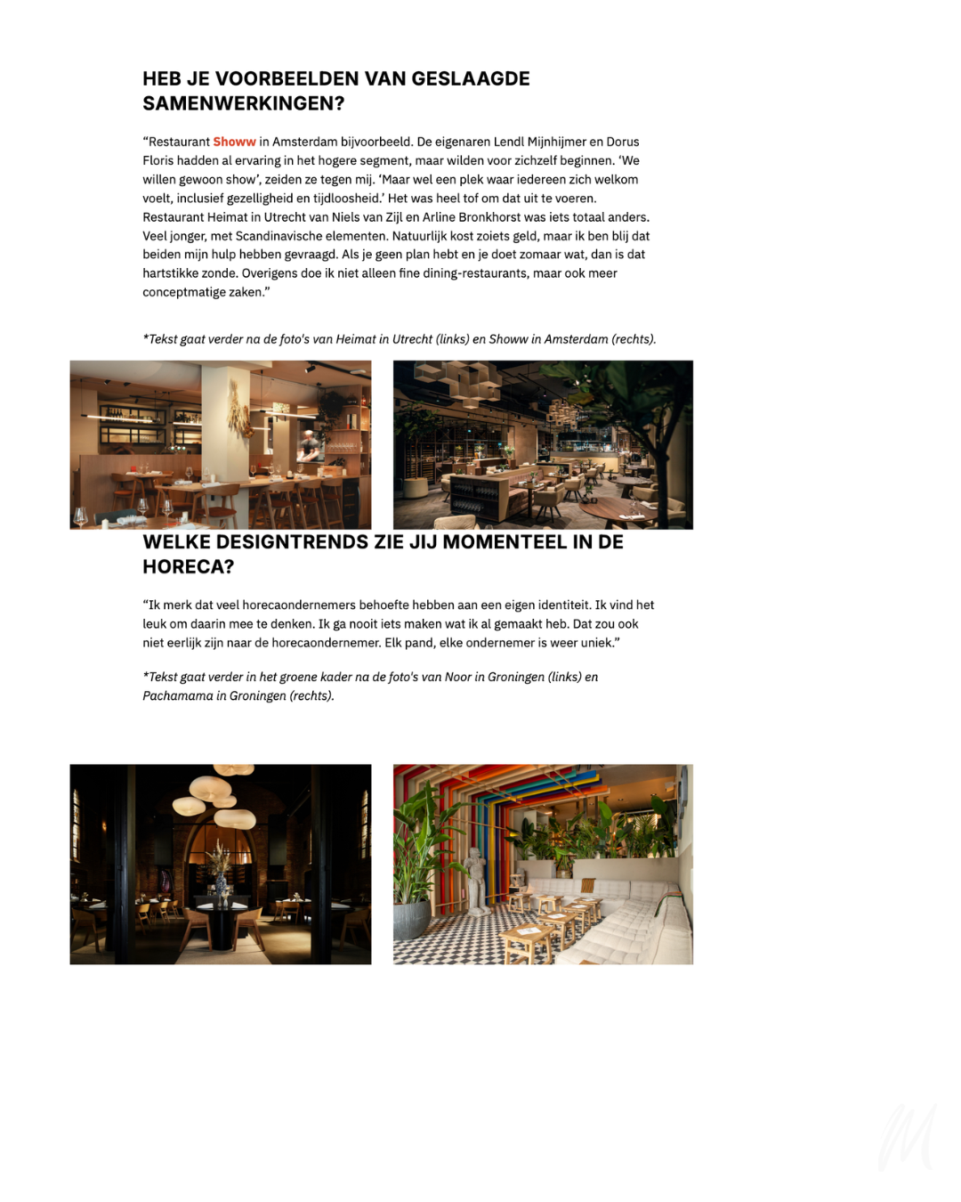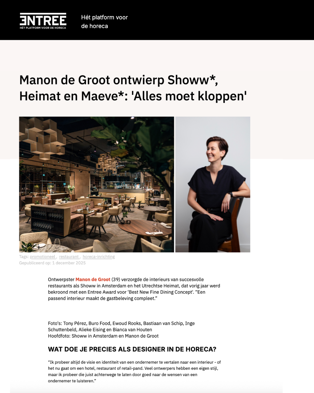 Ontwerpster Manon de Groot (39) verzorgde de interieurs van succesvolle restaurants als Showw in Amsterdam en het Utrechtse Heimat, dat vorig jaar werd bekroond met een Entree Award voor ‘Best New Fine Dining Concept’. “Een passend interieur maakt de gastbeleving compleet.”