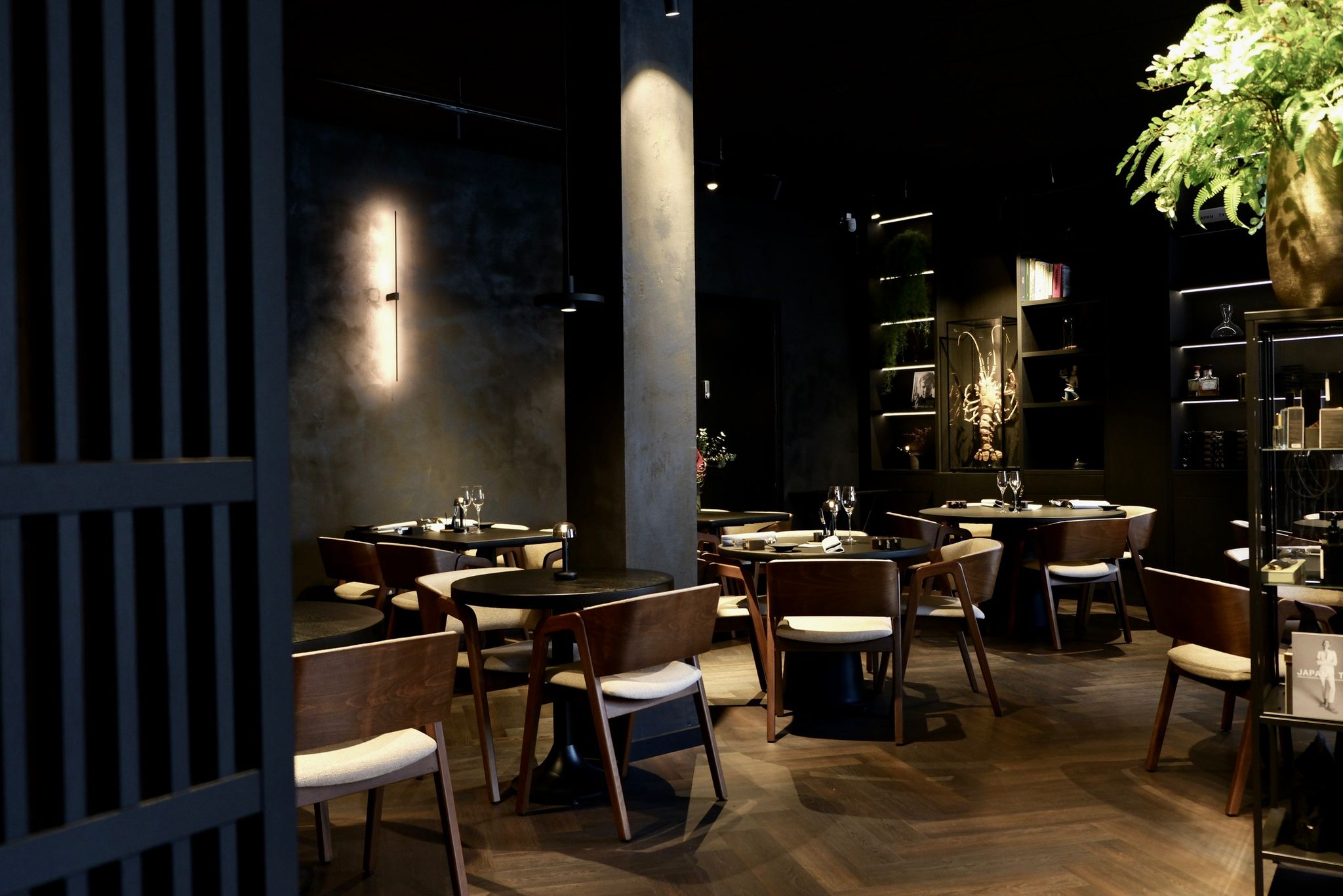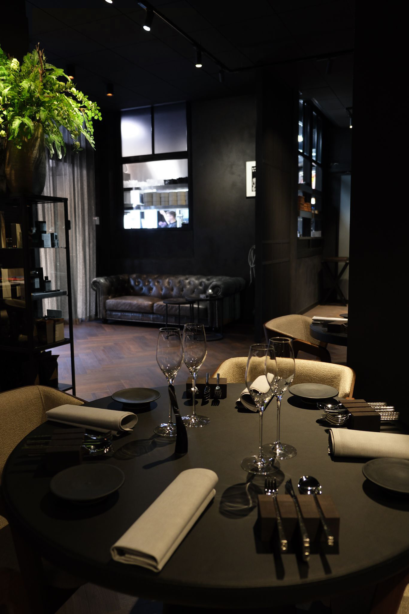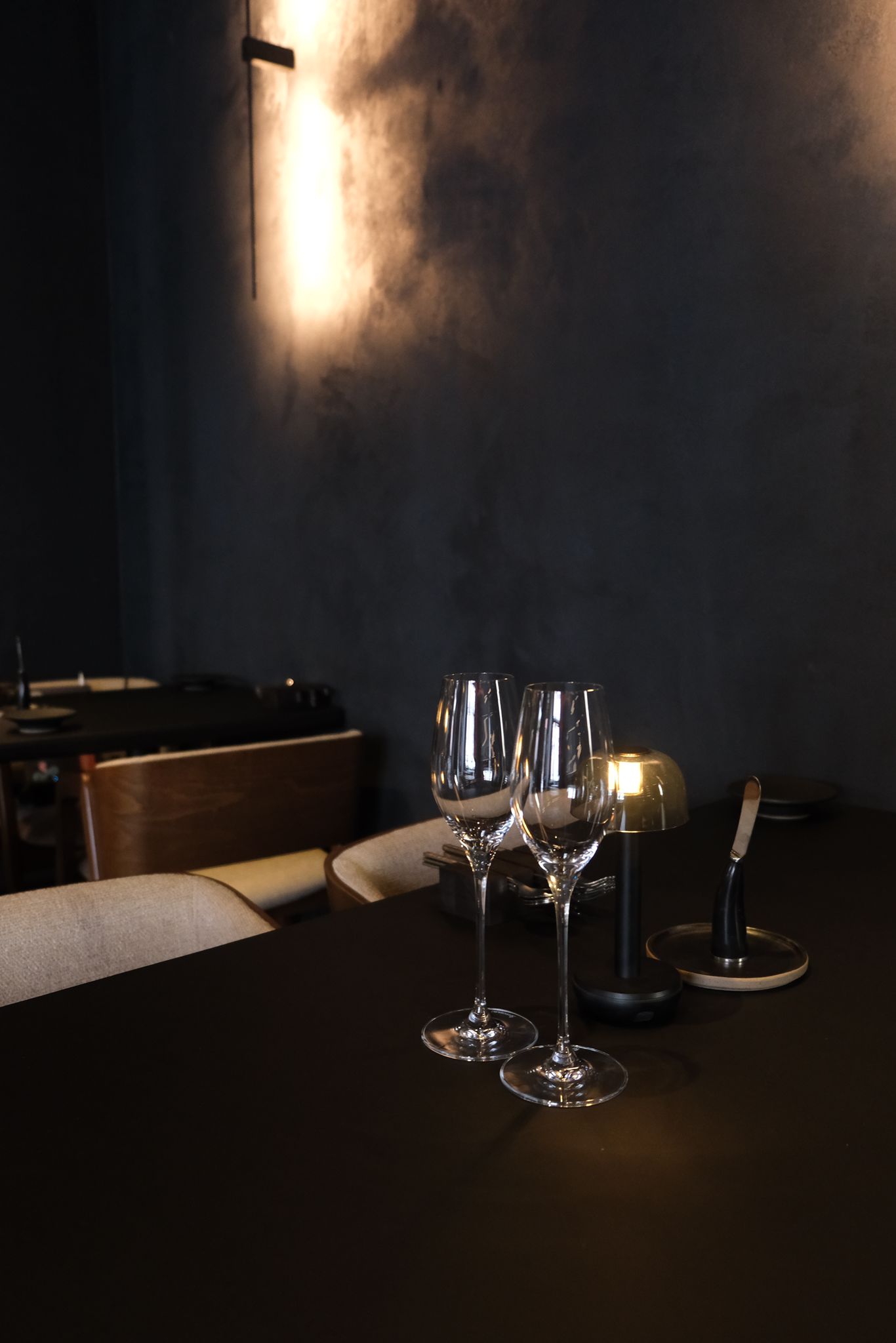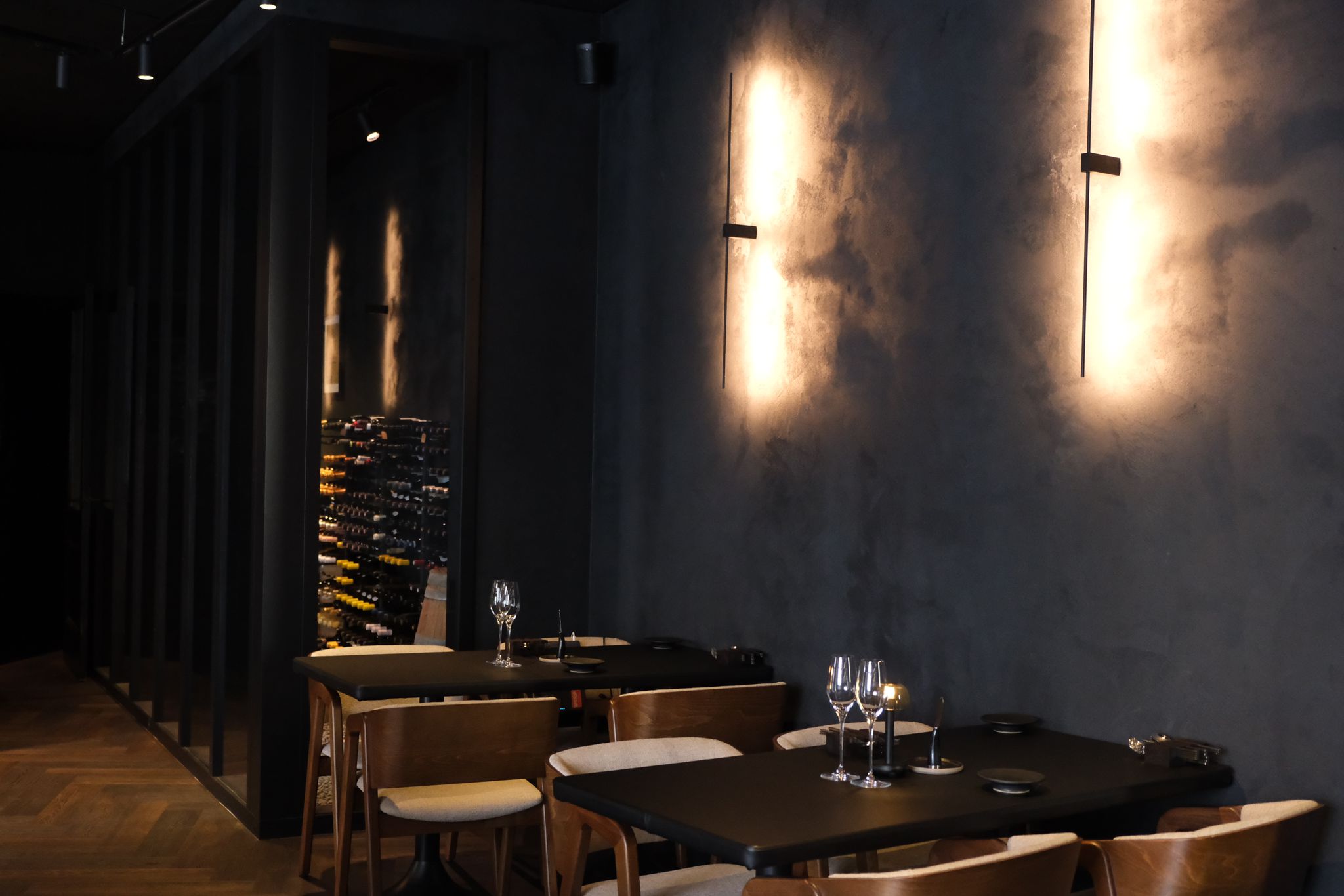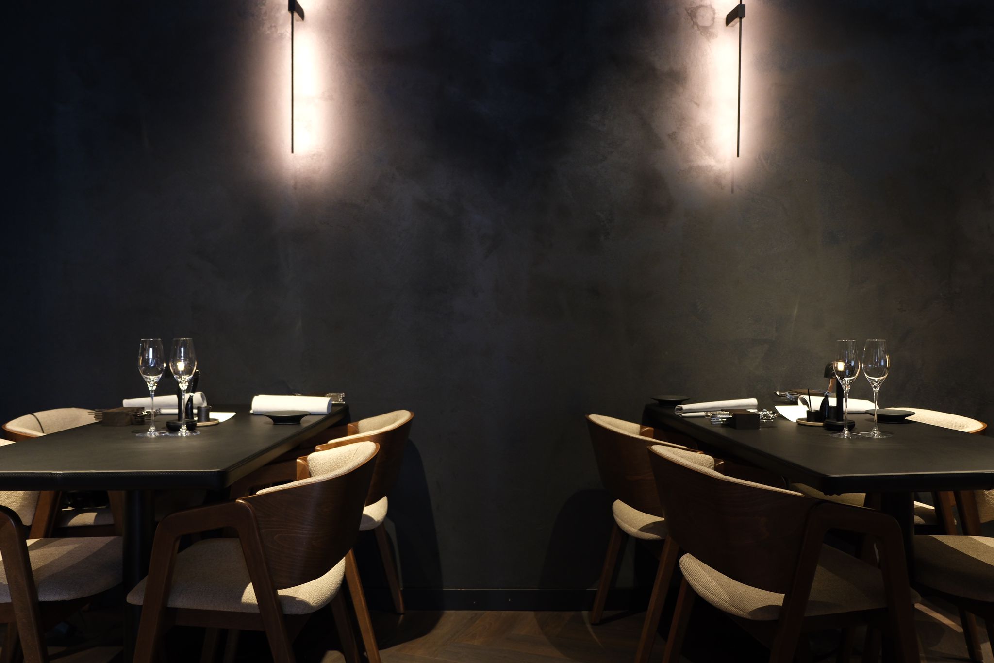 De ruimte is donker uitgevoerd, met wanden en plafonds in één kleurstelling. Dit zorgt voor een rustige basis en legt de nadruk op het eten en de tafels. Verlichting is laag en gericht, aangevuld met kaarslicht, waardoor een intieme sfeer ontstaat.