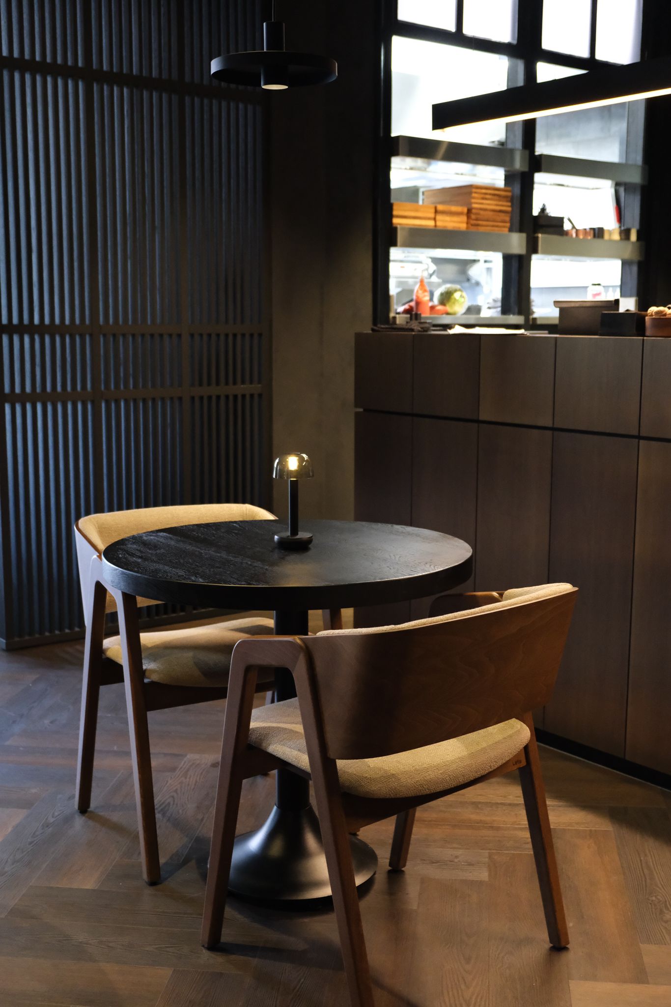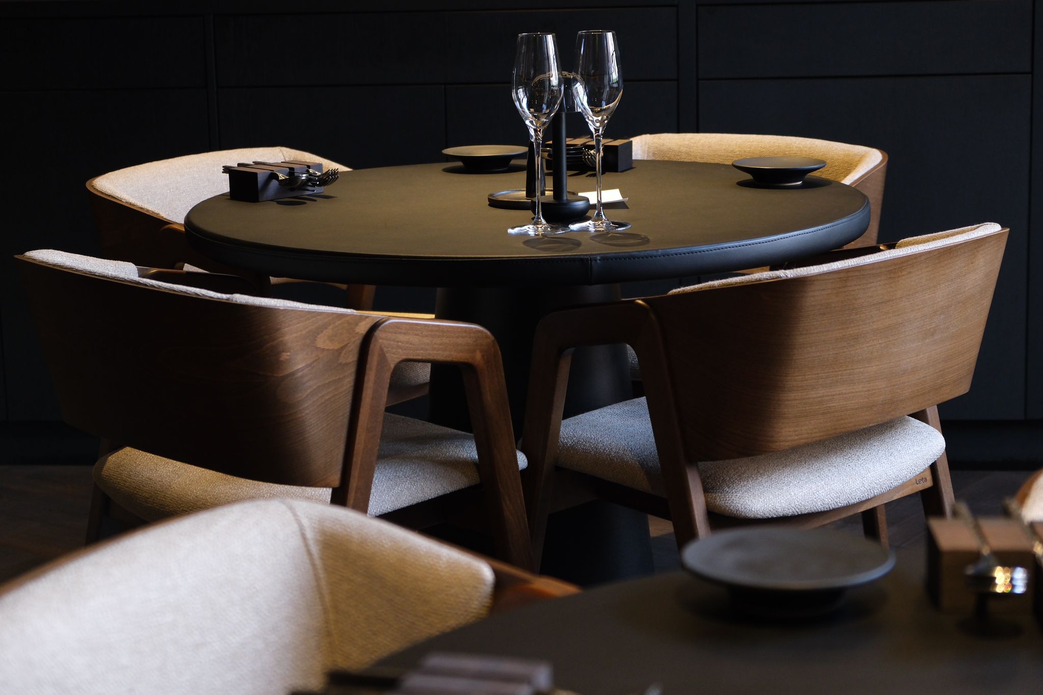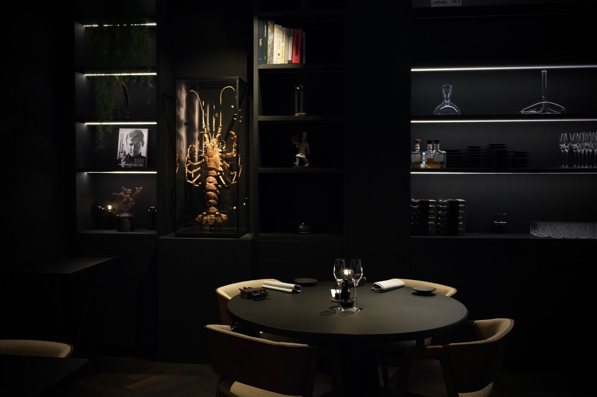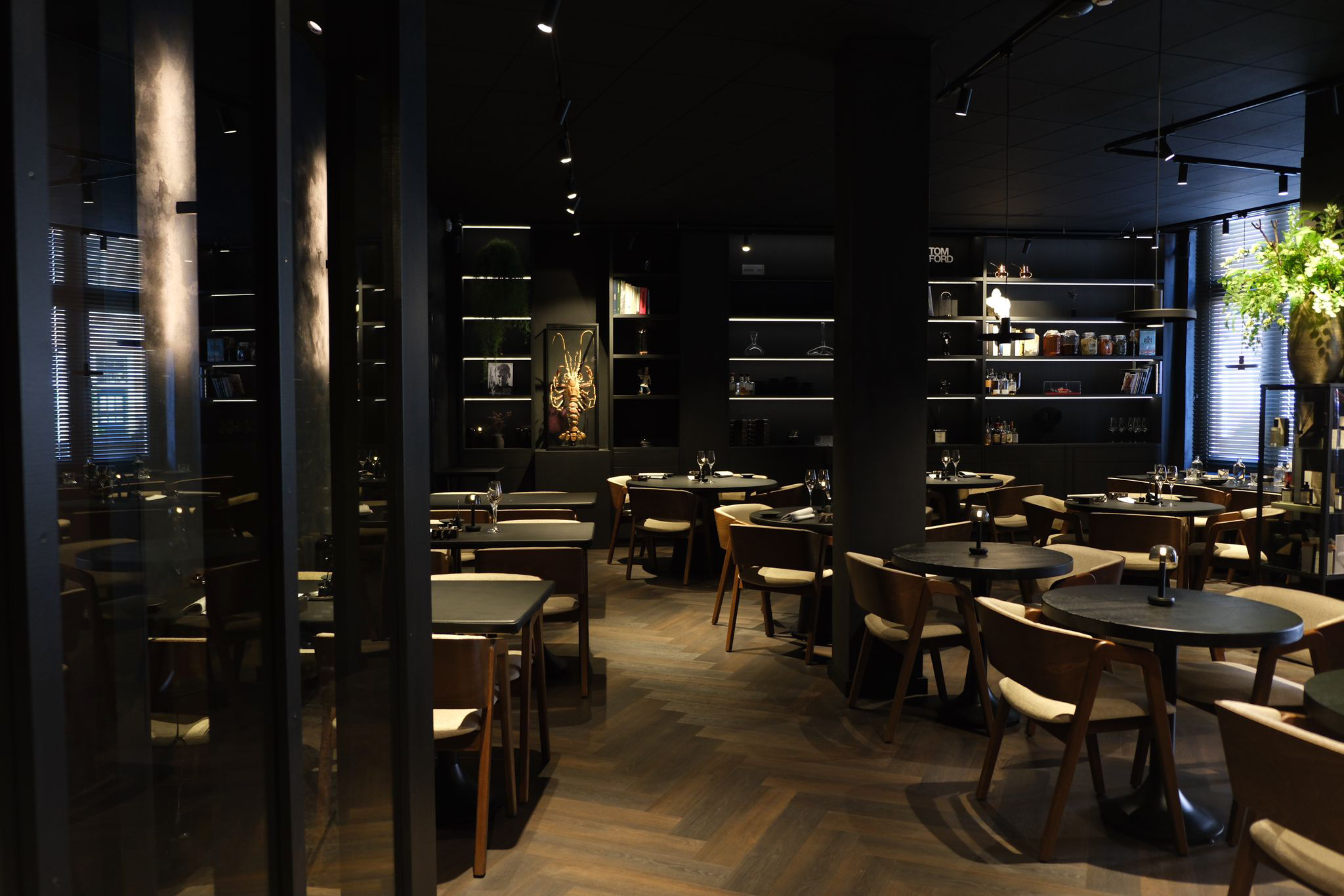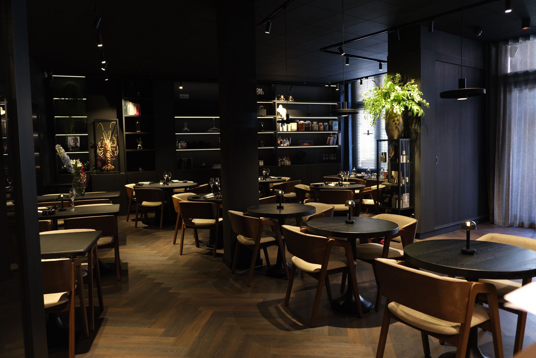 De ruimte is donker uitgevoerd, met wanden en plafonds in één kleurstelling. Dit zorgt voor een rustige basis en legt de nadruk op het eten en de tafels. Verlichting is laag en gericht, aangevuld met kaarslicht, waardoor een intieme sfeer ontstaat.