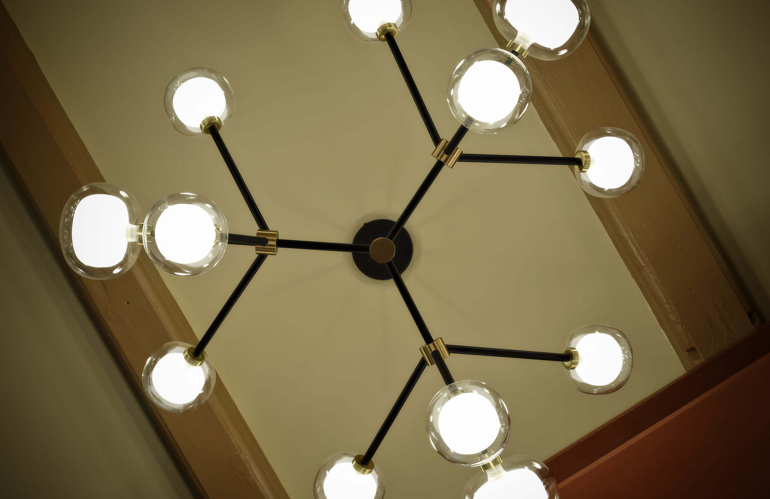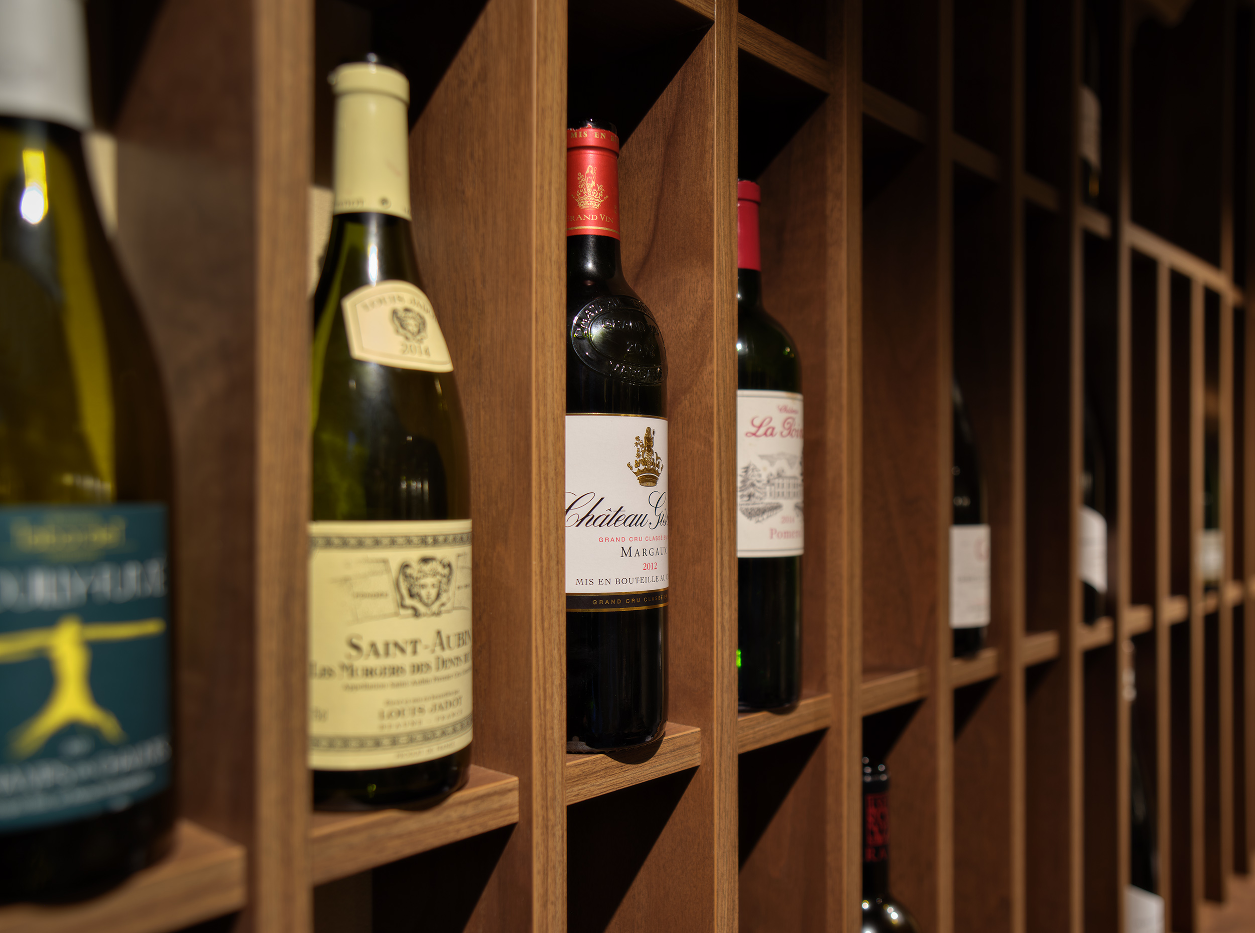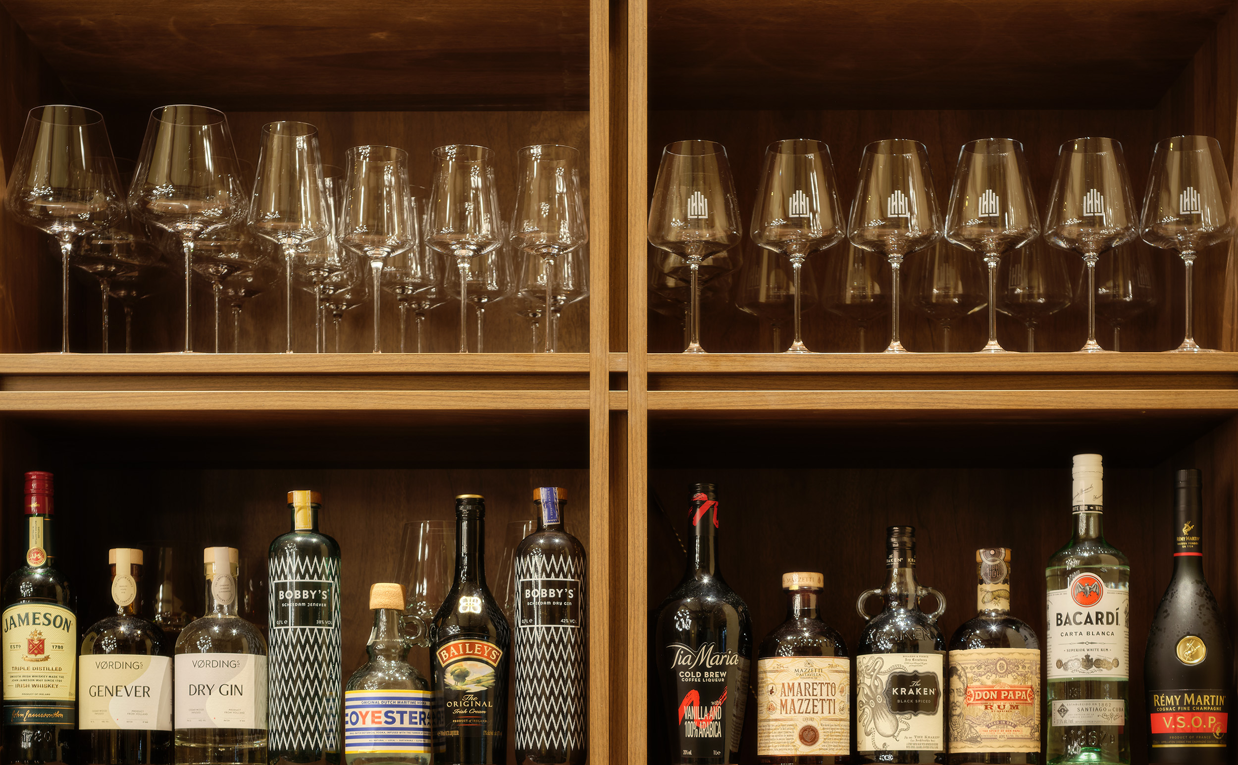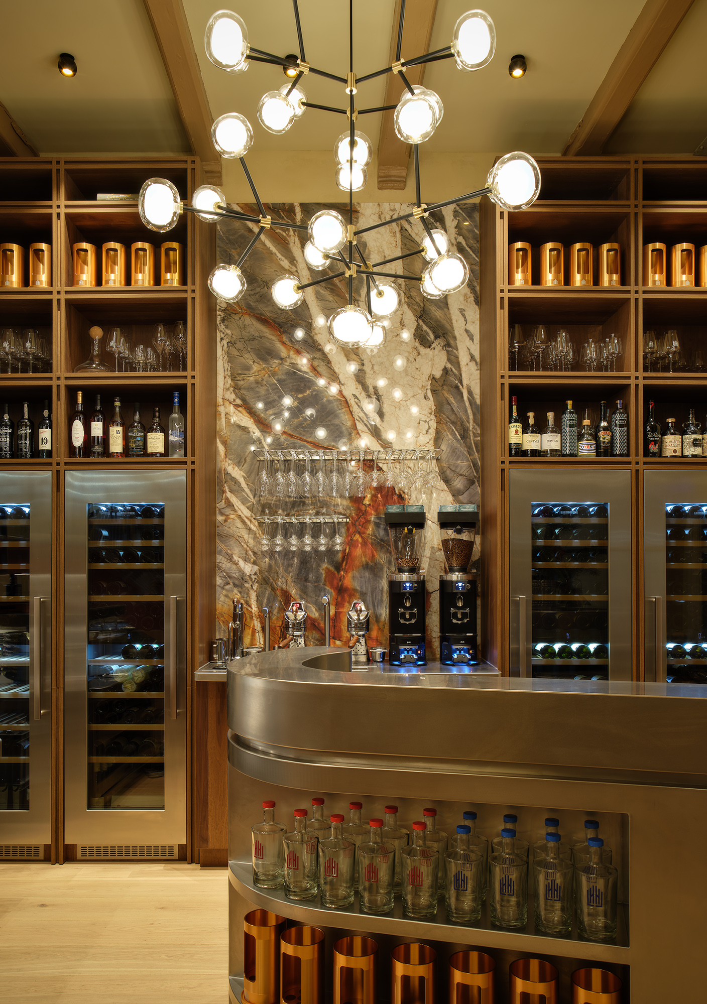 Blikvanger bij binnenkomst is de wijnbar: een organisch vormgegeven element in RVS, gerealiseerd door Rosval, net als de keuken. De bar wordt omkaderd door maatwerk wijnkasten in hout, gecombineerd met een keramische achterwand en een op maat ontworpen kroonluchter.