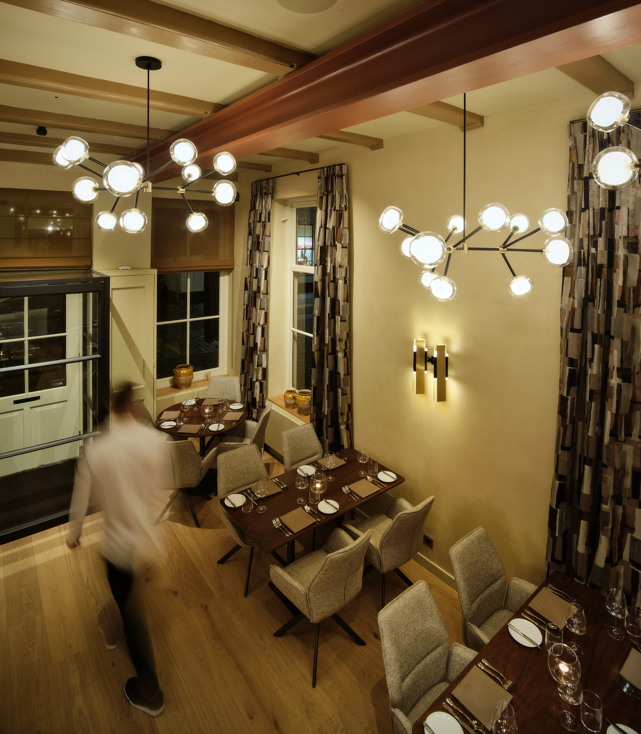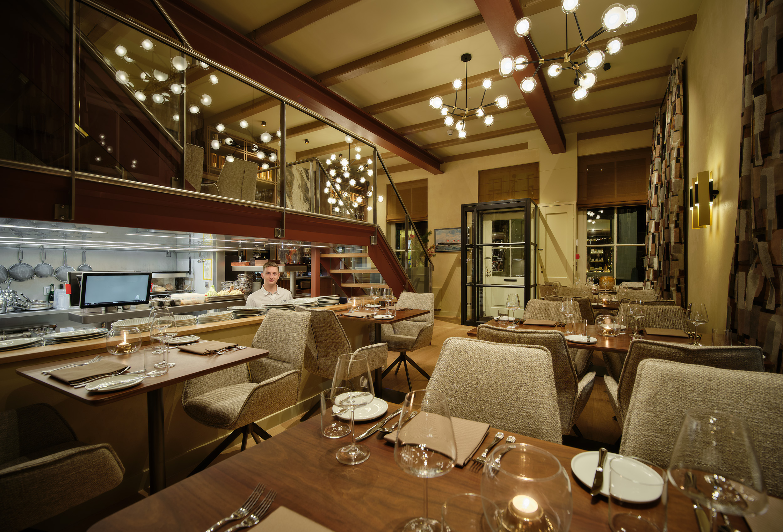 Het restaurant beslaat drie verdiepingen. Op de eerste verdieping bevindt zich een flexibele ruimte voor private dining, ingericht met een lange bank en ronde tafels, passend binnen de vormentaal van het geheel.