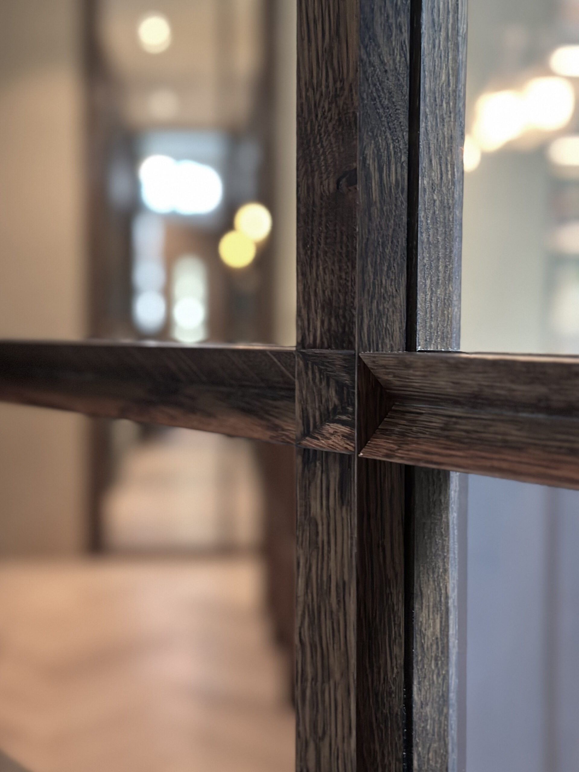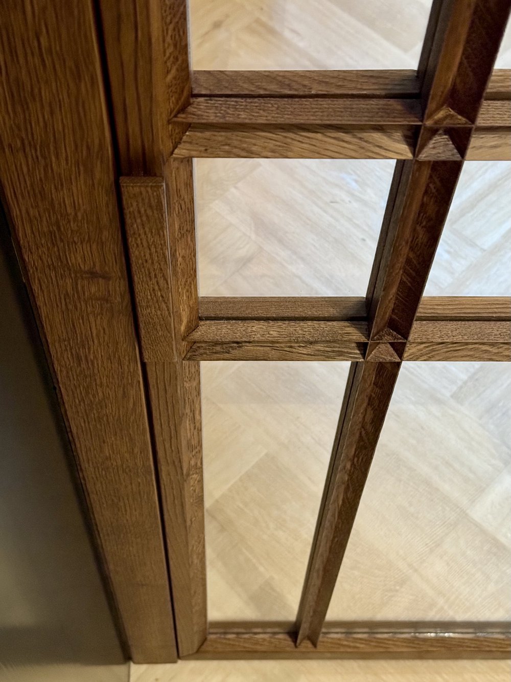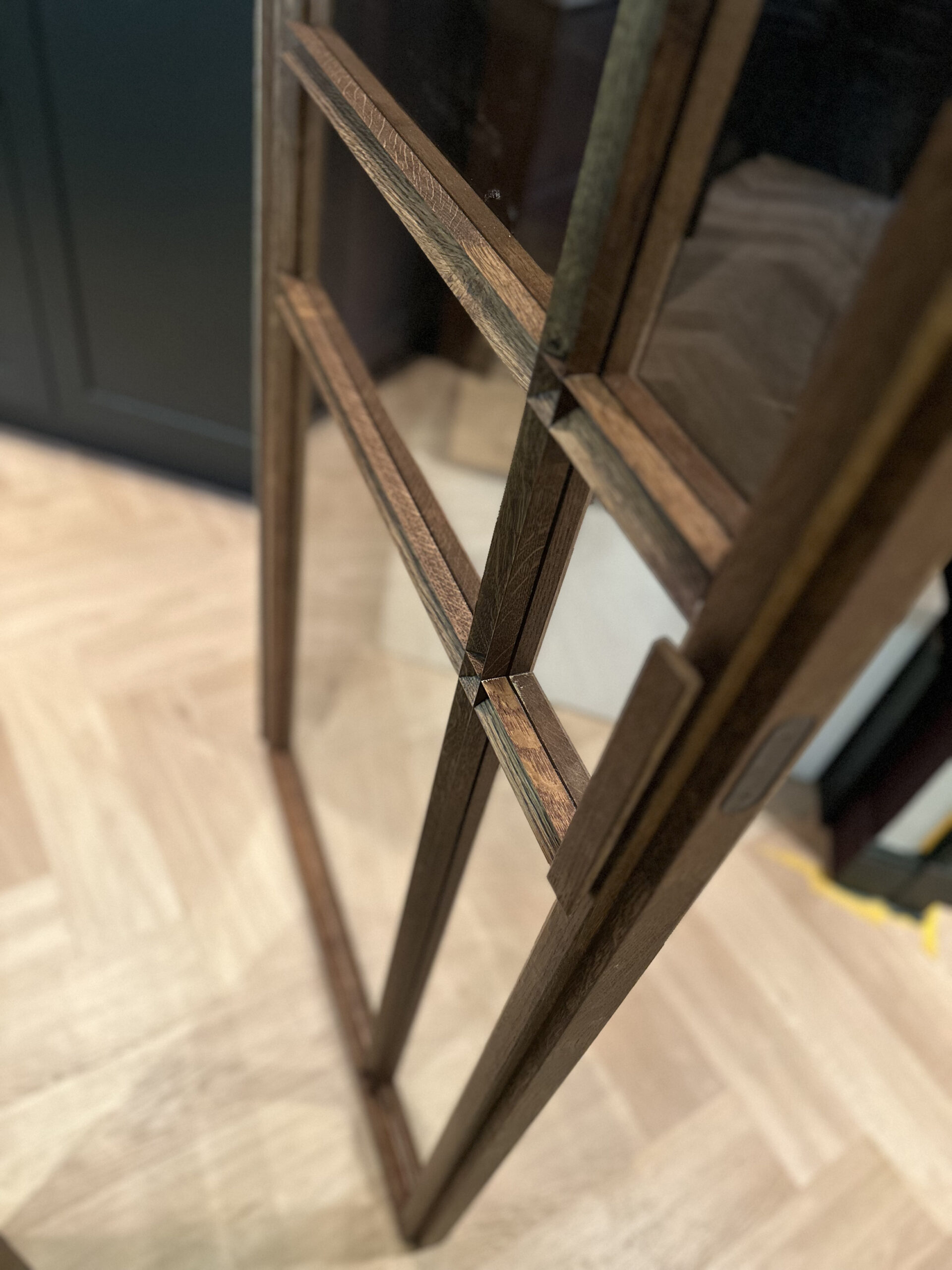 ‘Glazen deuren met unieke V-vormige eikenhouten stijlen’