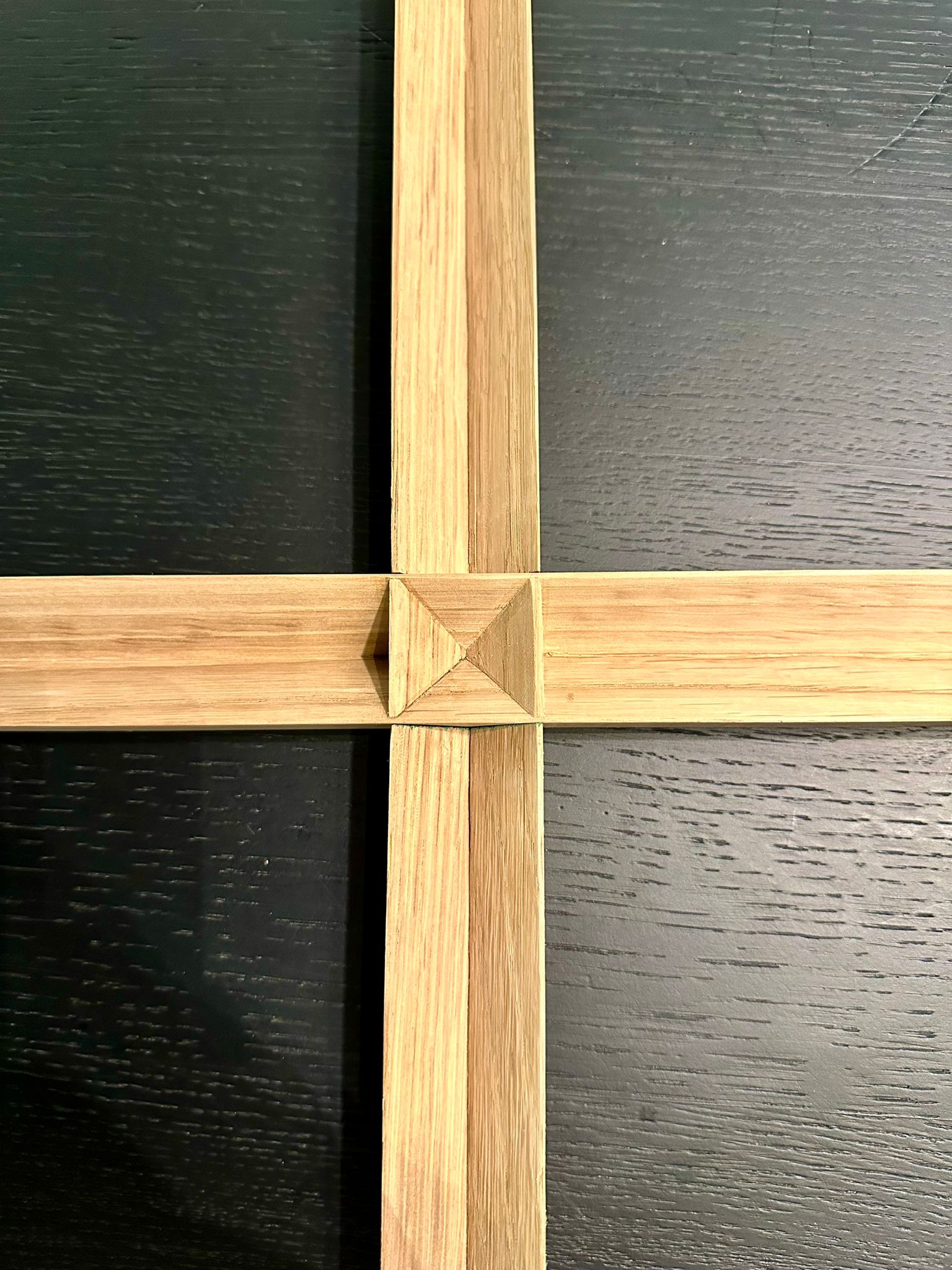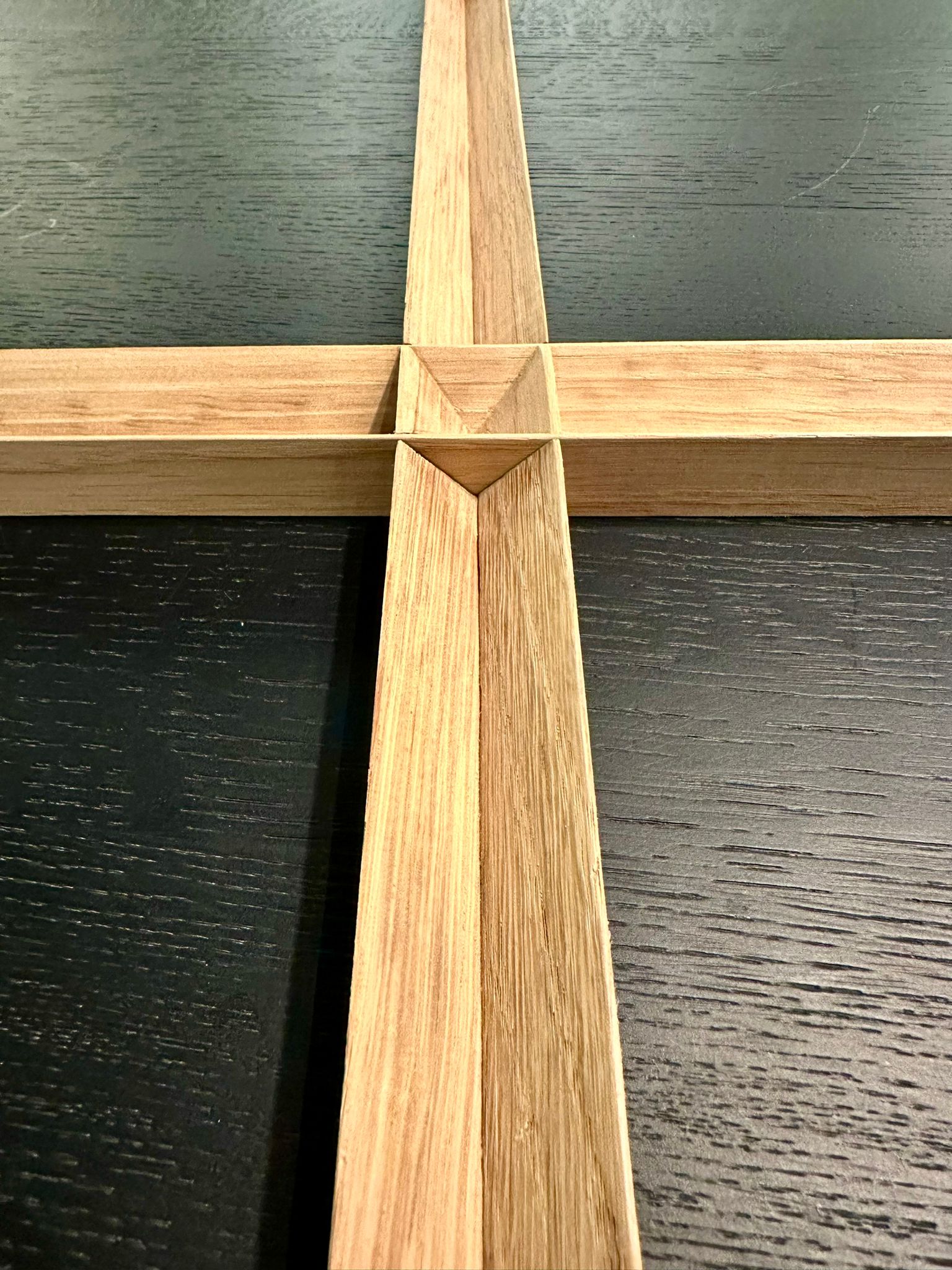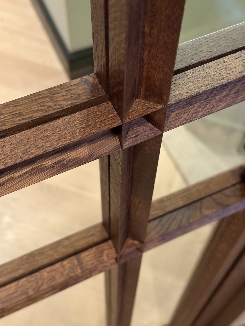 ‘Glazen deuren met unieke V-vormige eikenhouten stijlen’